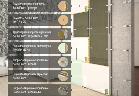 Бескаркасная система звукоизоляции SoundGuard Премиум. Устройство бескаркасной системы звукоизоляции SoundGuard осуществляется следующим образом: