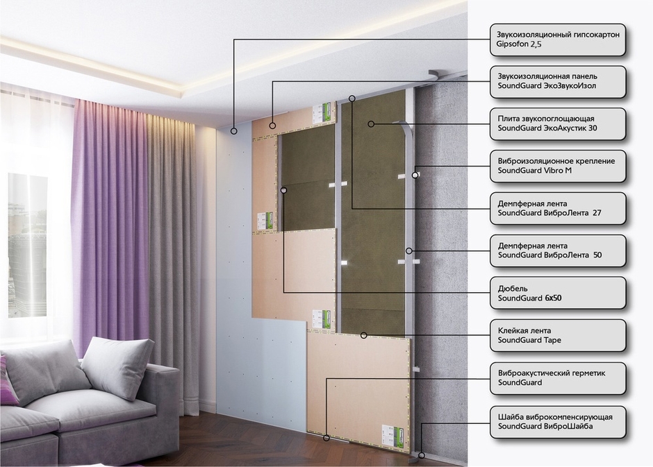 Звукоизоляционные панели SoundGuard ЭкоЗвукоИзол применяются как в каркасных, так и в бескаркасных системах звукоизоляции.