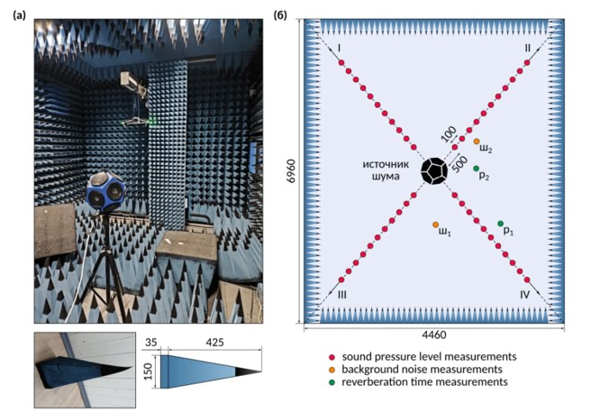 В рамках работы команда провела измерения фонового шума и исследовала распределение уровней звукового давления в камере. По результатам анализа установлено, что на расстоянии до 0,9 м от источника камера может считаться заглушенной в широком диапазоне частот вплоть до 3150 Гц. При увеличении расстояния критерии ГОСТ-ISO 3745-2014 также подтверждаются по всем направлениям измерений, хотя уже в более узком частотном диапазоне. Дополнительно подтверждено выполнение критериев по фоновым уровням шума.