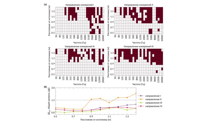 В рамках работы команда провела измерения фонового шума и исследовала распределение уровней звукового давления в камере. По результатам анализа установлено, что на расстоянии до 0,9 м от источника камера может считаться заглушенной в широком диапазоне частот вплоть до 3150 Гц. При увеличении расстояния критерии ГОСТ-ISO 3745-2014 также подтверждаются по всем направлениям измерений, хотя уже в более узком частотном диапазоне. Дополнительно подтверждено выполнение критериев по фоновым уровням шума.