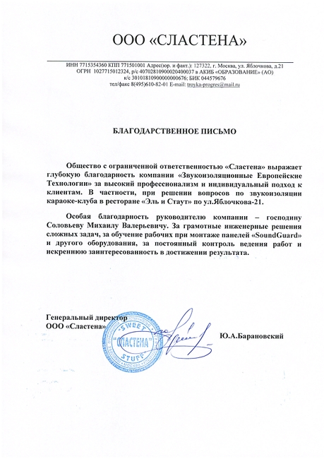 Звукоизоляция караоке-клуба 29 апреля Благодарственное письмо за звукоизоляцию караоке-клуба в ресторане "Эль и Стаут" Поделитьсяс друзьями Последние новости Распродажа гипсокартона Gipsofon ПЛУК 0,4 м 4 июля Распродажа звукоизоляционного мата SoundGuard Cover Eco Base 4 июля Комплексная звукоизоляция в строящемся жилом комплексе «Атлант» (видео) 27 января Все новости